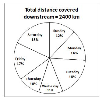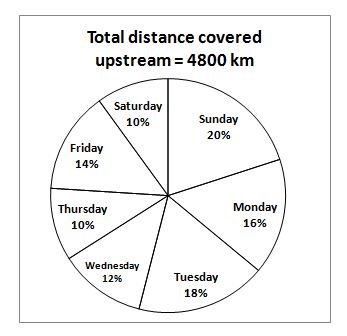 Directions (1-5): Study the data given below and answer the following questions. The pie charts shown below shows the distance covered by a boat moving upstream and downstream in different days of a week. And the table shows the speed of stream in km/hr. in different days of a week.